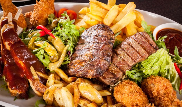 Shoarma, kipfilet, kebab, spareribs, 4 pita broodjes, salade en frietjes