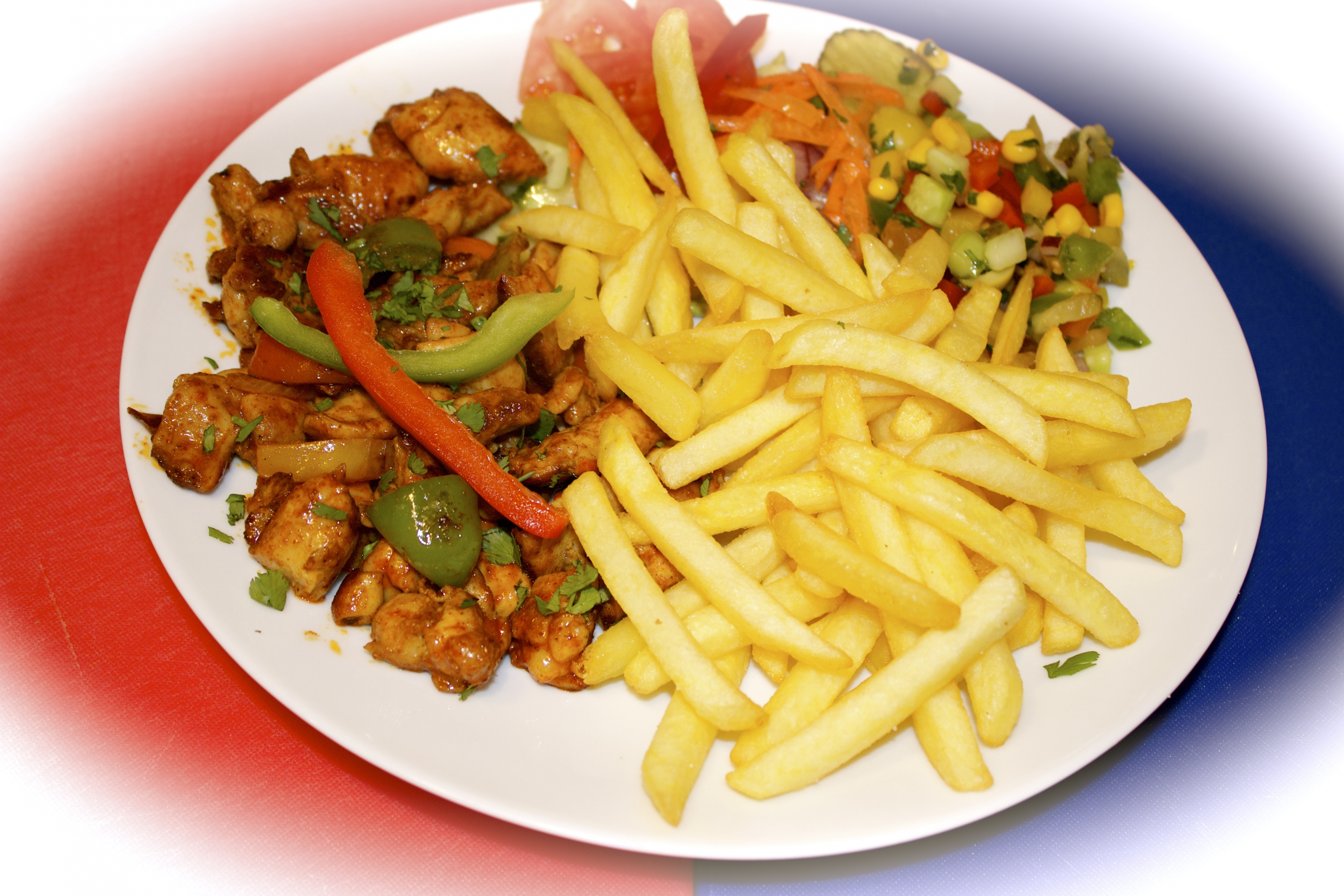 Kipfilet met paprika,champignons en ui,friet,salade,pitabrood en saus